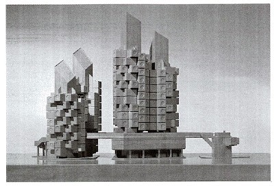 Kurokawa's project was a bit more ambitious than the one that was actually built, and consisted of two towers housing the capsules, that could be growing organically according to future needs, according to Metabolist principles.