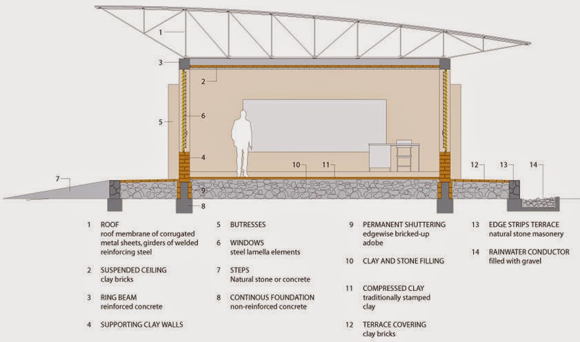 However, his proposal to use clay was not welcomed by the members of the community, who wanted to use more "Western" materials. However, he manage to convince them to use traditional materials with experimental techniques such as steel rods to reinforce the clay, vaulted elements or manually tamping clay to make the floor, which then was polished by hand with stones, Kéré and the community successfully developed its first school in Gando.